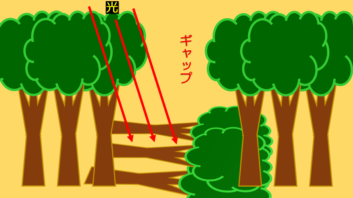 林床に光が届くようになった場所をギャップといいます。