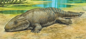 ユーステノプテロンが陸上に進出してイクチオステガのような原始的な両生類へ進化しました。