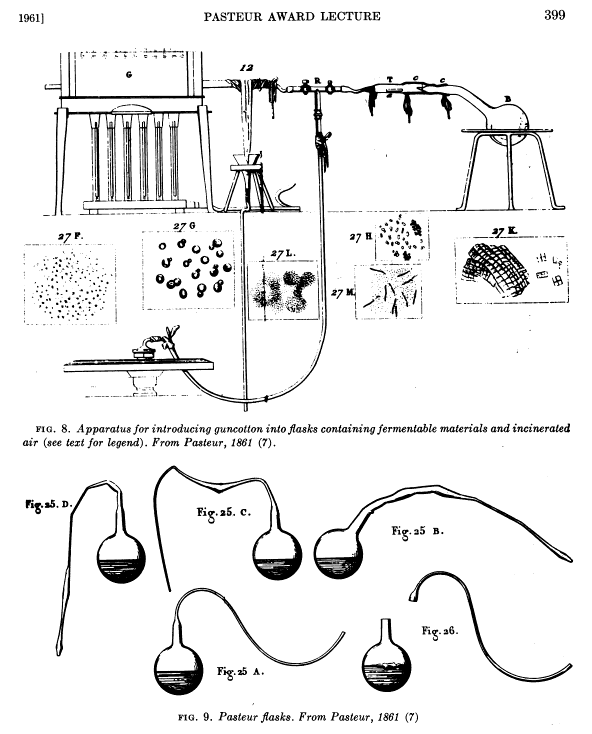 […] 問:スパランツァーニとパスツールの実験により自然発生説が否定されたのか? 両者は同じ実験をしたのか?答:スパランツァーニは2つのフラスコに入った肉汁を煮沸し、片方のフラスコの口を溶封して密閉した結果、口の開いたフラスコの肉汁のみ腐ることを示し通気しなければ微生物が入らず増殖しないことを証明した。しかし、新鮮な空気の出入が肉汁を腐らせる可能性を否定できなかった。それに対し、パスツールは、新鮮な空気が出入りしかつ微生物の入らない工夫をした白鳥の首のフラスコでは肉汁が腐らないのに対し、白鳥の首の部分を切り取ったフラスコでは肉汁が腐ったことから、空気が入っても微生物が入らなければその増殖がないことを証明した(生物王への道 パスツールによるアリストテレスの自然発生説の否定 ニーダムとスパァランツァーニの論争 「スパランツァーニの実験」)。 […]