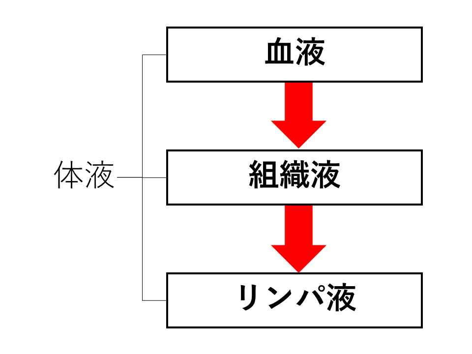 血管内を流れています。一部が毛細血管からしみ出して、組織液になります。