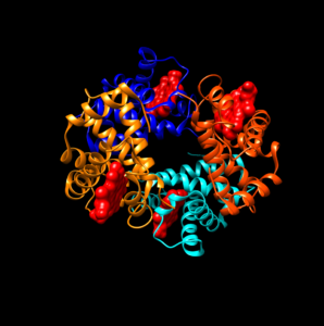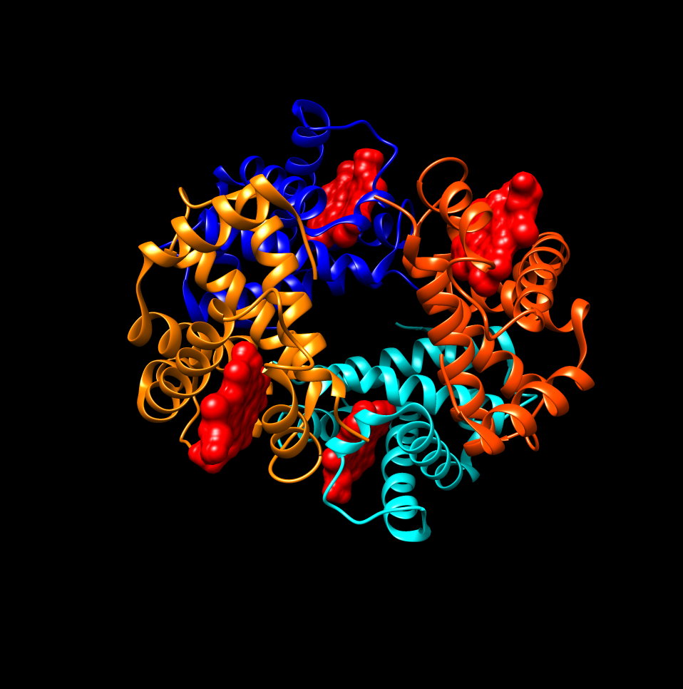 ヘモグロビンのPDB図 chimeraで筆者色付け 赤く潰されているのがヘムです。