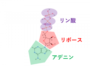 ATPはリボースとアデニンが結合したものに3分子のリン酸が結合した化合物です。