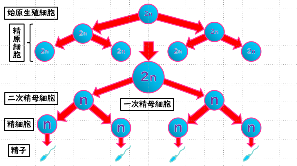 1つの一次精母細胞からは4個の精子が生まれるということになります。