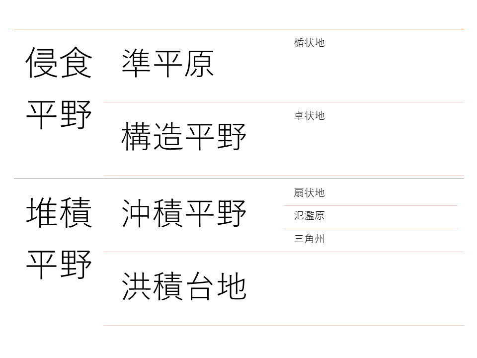 沖積平野ちゅうせきへいや洪積台地こうせきだいちに分類されます。