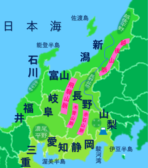 東海地方・北陸地方・中央高地の3つに区分けされます。