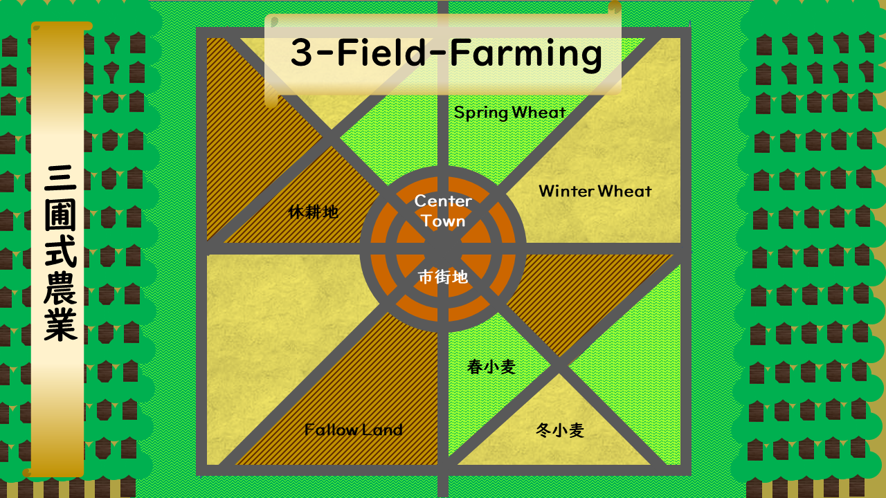 の三つに区分してこれを1年毎にローテーションさせながら行う三圃式農業が発達していました。